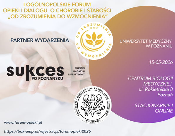 I Ogólnopolskie Forum Opieki i Dialogu o Chorobie i Starości „Od zrozumienia do wzmocnienia” odbędzie się 15 maja 2026 roku w Centrum Biologii Medycznej Uniwersytetu Medycznego im. Karola Marcinkowskiego w Poznaniu, w formule stacjonarnej oraz online.