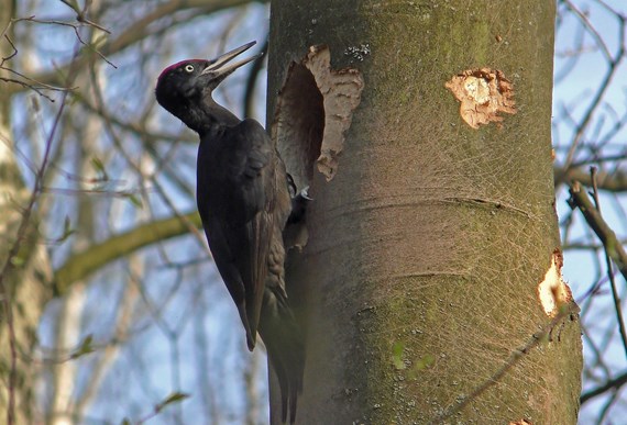 W tych samych stronach swoje gniazda wykuwa również dzięcioł czarny, który jest największym polskim, a nawet europejskim gatunkiem dzięcioła. Ptak wielkości wrony jest praktycznie cały czarny z czerwonym berecikiem na głowie. Żywi się chrząszczami oraz ich larwami. Pożywienie pozyskuje z martwych i zamierających drzew, a zimą delektuje się nasionami pozyskanymi z szyszek. To bardzo pracowity gatunek. Dziuple wykute przez tego osobnika służą nie tylko do wychowania młodych dzięciołów. Często z ich oferty mieszkaniowej korzystają inne gatunki ptaków, np. kraski czy gągoły, ale również inne zwierzęta, takie jak popielice, wiewiórki czy myszy leśne.