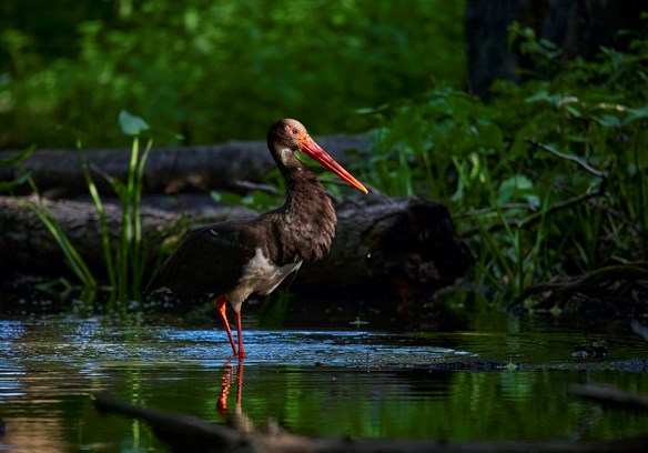 Innym ważnym i niezwykle rzadkim gatunkiem spotykanym w lasach Puszczy Noteckiej w okolicy Sierakowa jest bocian czarny. Czym się różni bocian czarny od białego? Bocian czarny niemal całe upierzenie ma w ciemnym czarno-fioletowo-zielonym kolorze z metalicznym połyskiem. Osiedla się z dala od osad ludzkich i gniazda tworzy w gęstych, starych lasach, gdzie ma dostęp do bagien czy strumieni. Stanowisko bocianów czarnych w Nadleśnictwie Sieraków jest zajmowane przez ptaki od ponad 24 lat. Sierakowskie bociany to znani internetowi influencerzy. Przez kilka lat, za sprawą Komitetu Ochrony Orłów, można było śledzić przez całą dobę materiał rejestrowany w gniazdach bocianów czarnych oraz transmisje na żywo prowadzone w sezonie lęgowym.