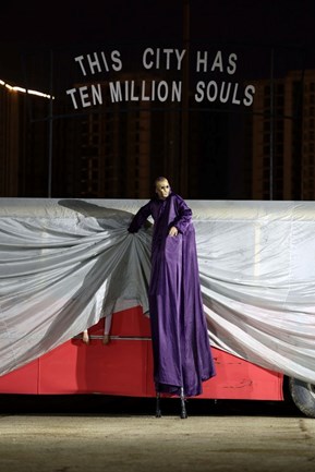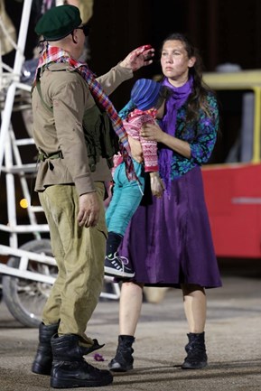 Wyobraźmy sobie tę scenerię. Baghdad's Celebration Square – miejsce monumentalne, naznaczone historią, przestrzeń publiczna, która pamięta parady wojskowe i wiwaty, ale też ciszę strachu. To tutaj polscy aktorzy rozstawili swoją scenografię. Nie ma tu pluszowych foteli, kurtyny i bileterek. Jest żywioł. Teatr Biuro Podróży to mistrzowie pleneru. Ich scena to asfalt, niebo i powietrze, którym oddychają widzowie.