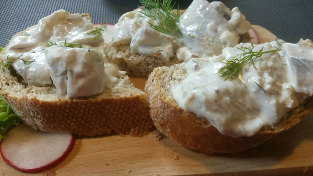 Kiedy moczy się ryba, pokrójcie w drobną kostkę cebulę, jabłka umyte ze skórką i jak uda się Wam kupić dymkę, to tę cebulę z zielonym też pokrójcie. Pamiętajcie, że jabłko dobrze jest skropić sokiem z cytryny, by nie zaczęło brązowieć. Tylko nie za mocno. Kiedy mamy wsad, dodajecie do niego śmietanę 30-procentową i majonez w proporcji 2:1 na korzyść śmietany. Doprawcie pieprzem, soli nie tykajcie. Wymieszajcie i odstawcie. Teraz podzielcie wymoczonego śledzia na kawałki na jednego hapsa i wymieszajcie z sosem. Włóżcie do słoika, zakręćcie i wstawcie do lodówki. Niech wszystko się przegryza. Do pierwszej gwiazdki powinno być oki. Lepiej by było to zrobić jeden dzień wcześniej, jeśli udało Wam się trochę wcześniej przypomnieć o wigilii.