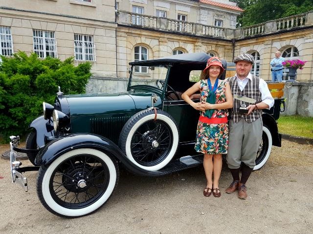 LM: Ubiór jest częścią rajdu i elementem Konkursu Elegancji, musi być adekwatny do rocznika auta. To wymagało ode mnie ogromnego zaangażowania w poszukiwanie wiedzy na temat mody lat 20. i 30. XX wieku. Trafiłam do pani, która jest krawcową w Teatrze Polskim w Poznaniu i ma oryginalne katalogi „Vogue’a” z tamtych lat. Wystylizowała nas tak, żebyśmy byli spójni z naszymi fordami.