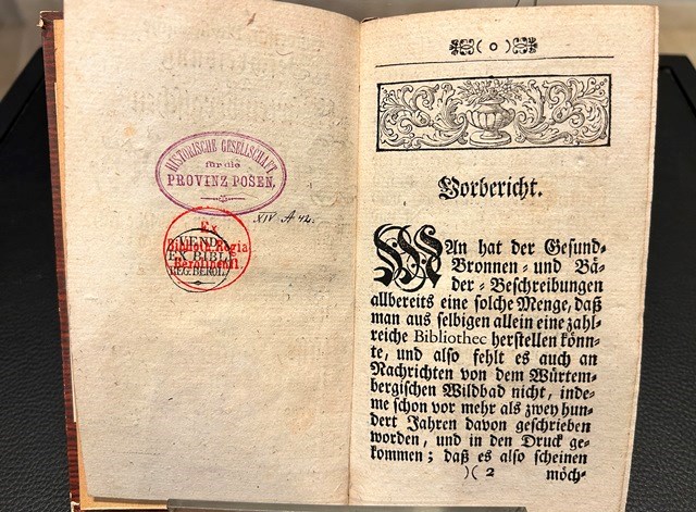 Ostatnim, równie ważnym nabytkiem, jest starodruk Johanna Albrechta Gesnera, „Historisch –physicalische Beschreibung des würtembergischen Wild – Bades...” z 1745 roku. Ten cenny wolumin wraca do księgozbioru Biblioteki Uniwersyteckiej w Poznaniu.