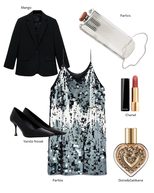Propozycja na sylwestra to szałowa sukienka cekinowa wraz z klasyczną czarną marynarką zarzuconą na ramiona. Metaliczna torebka na łańcuszku i czarne szpilki z ciekawym wykończeniem obcasa.