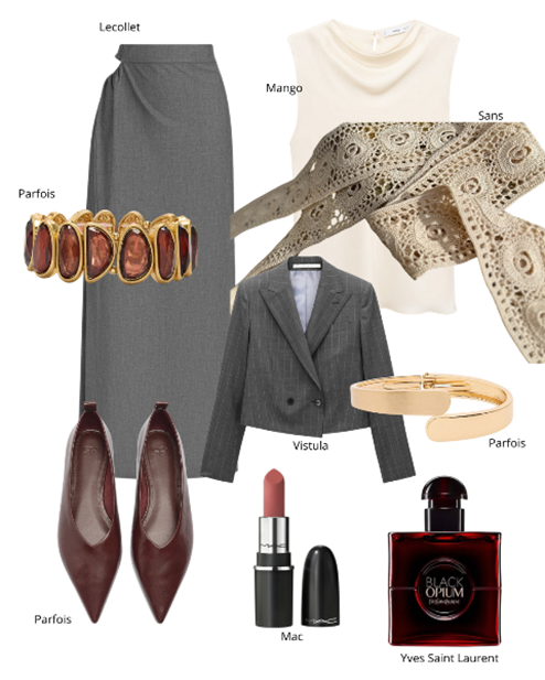 Pierwszy zestaw na wigilię to piękna klasyczna szara spódnica, która ma lekkie wycięcie w pasie, co sprawia, że jest unikatowa i od razu robi wrażenie. Do tego satynowa kremowa bluzka, która będzie noszona z koronkową krawatką owiniętą wokół szyi. Do tego rozpięta krótka szara marynarka, złota biżuteria i skórzane balerinki z wydłużonym noskiem.