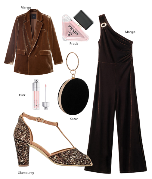Druga stylizacja sylwestrowa to welurowy kombinezon w kolorze czekolady wraz z marynarką, cekinowe buty na słupku oraz czarna, mała torebka do ręki.